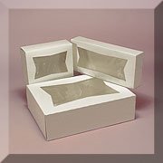 White bakery boxes inside and out, with clear cello windows on the top. These boxes come as a flat sheet and are set up by folding up and locking together the sides. NOTE: Length is the widest dimension of the opening into the box. Width is the smallest dimension of the opening into the box. Depth is the distance into the box from the opening to the bottom of the box.