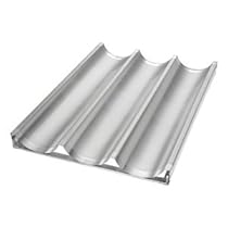 Baguette/French Bread Pan, Size Overall 17-3/4 In. W x 25-3/4 In. L x 1-3/4 In. D, Loaf 5-3/16 In. W x 26 In. L, Material Glazed Aluminum, Gauge 16 Baguette, Sub Sandwich, and Bun PansGlazed aluminum steel construction, except 11M754, 11M756, 11M760, and 11M762 are made of a high-tensile strength aluminized steel, which makes them stronger yet lighter than traditional pans. Baguette pans have round bottoms to bake traditional French and Italian breads. Sub Sandwich Roll Pans have flat bottoms. All baguette, sub, and hoagie pans, except 11K098 and 11K101, have a Uni-Lock design that connects the frame and panel without individual fasteners or welds. End caps limit the maximum roll length for uniformity.Include AMERICOAT Plus silicone bakery release coating.