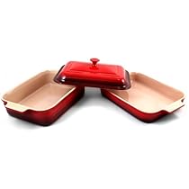Perfect for baking, serving, and even storing, this three piece stoneware bakeware set from Le Creuset is a great way to spice up your cookware. This versatile set includes a rectangular casserole dish, a rectangular baking dish, and a lid that fits both pieces. Fabricated from cherry stoneware, each piece is fired at 2156 degrees Fahrenheit, making it virtually nonporous so it won't absorb flavors, odors, or moisture. The enameled surface makes the pieces incredibly resistant to scratches, chipping, and staining, while the sure-grip handles on both dishes allow for safe maneuvering directly from oven to table. Heat safe up to 500 degrees F, this set is safe for the oven, grill, broiler, microwave, and freezer. Enjoy making delicious hot meals for your family with this perfectly sized all-in-one set, then easily clean it in the dishwasher when you're finished. Backed by a five year limited warranty, this durable set is perfect for every kitchen.Casserole dish -- 12-1/4" L x 9-1/2" W x 3" H, with a 4.5 quart capacity Baking dish -- 12" L x 9" W x 2-1/4" H, with a 3 quart capacity.