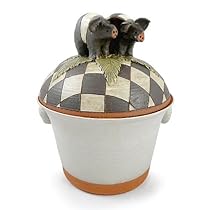 Ceramic artist Sandra McKenzie Schmitt conceives sculptural works with a classic Americana style - often functional, sometimes whimsical, but always timeless. Crafted of high-fired red stoneware, the casserole dish is perfectly functional and safe for the dishwasher, oven, and microwave. Two charming Hampshire-breed pigs, also sculpted of stoneware, sit proudly atop the casserole lid with a black and white checkerboard pattern. The medium round casserole holds 2.5 quarts, perfect for your main dish served directly from the oven to the table. Dinner never looked so pretty!Handmade in the USA. Measures approximately 10.5" tall x 8.5" wide ; holds approximately 2.5 quarts. Chef Julia Child owned one of Sandra's covered casserole dishes, which can now be found on display in Child's reconstructed kitchen at the Smithsonian in Washington, DC. Coordinating bunny utensil holder and sculpture also available.