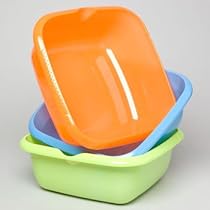 "Square Dish Pan. 13.5"" Square X 5""H., 6 Assorted Solid Colors In Counter Display., light blue, orange, light green, red, purple, white.", Case Pack 48.