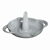 Staub 1200023 Ideal solution for tender poultry with a crispy exterior. The wide base is excellent for roasting vegetables. Features: -Vertical roaster. -Black color. -Cast iron construction. -Roasting dishes retain and redistribute heat evenly and effectively. -No seasoning required. -Matte enamel won't discolor, rust or chip. -Staub provides lifetime guarantee which covers any manufacturing or quality defect.-Made in France. -Overall dimensions: 5.8" H x 12.5" W x 10.4" D.