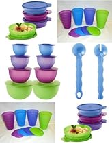 Use this set of virtually unbreakable Tupperware for your outdoor patio or pool decks. This 24 piece set features high style and is ideal for big outdoor famil or friendly gatherings. It includes 8 impressions bowls, 8 impressions microwave cereal bowls and 8 impressions 11 oz/300 mL tumbers with drip less straw seals.You get two each of the 5 1/2 cup/1.2L, 10-cup/2.5L, 18-cup/4.2L and 32-cup/7.6L Impressions bowls with seals. You get 2 sets of the impressions microwave cereal bowls with seals, for a total of 8 bowls and seals. Each bowl holds 2-cups/500 mL and you get 8 of the 11 oz/330 mL tumblers with 8 dripless straw seals.
